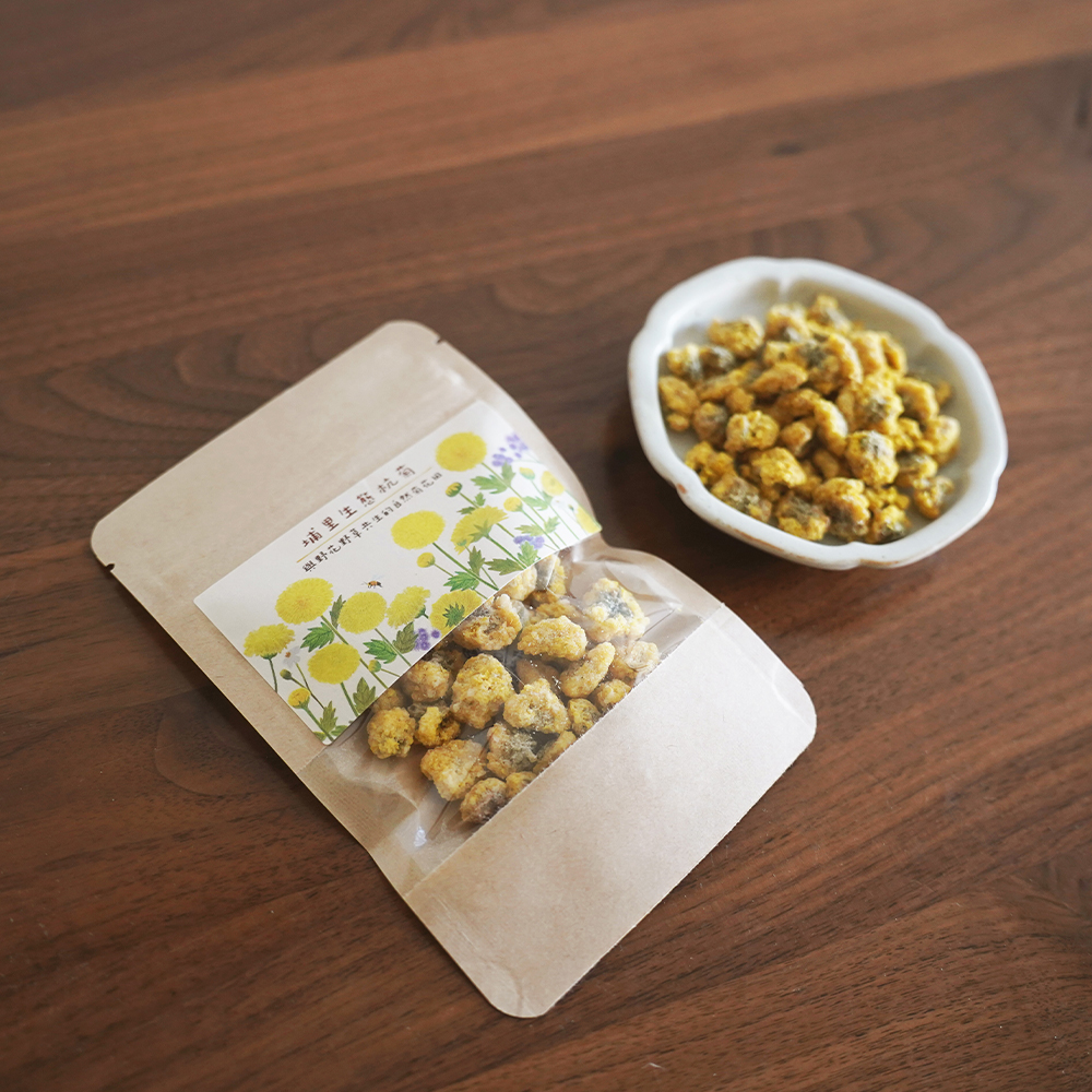 由陳守安耕作的珠仔山菊花田,以草生栽培方式,堅持不用農藥、除草劑。採收季節時號招親朋好友一起下田,朵朵手工摘採,再經乾燥後成為可安心沖泡的生態菊花茶。