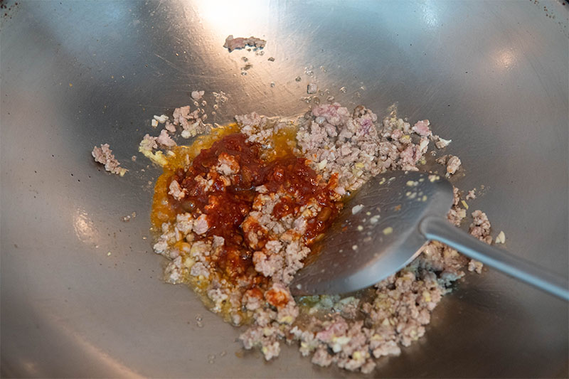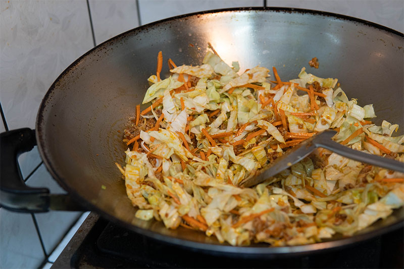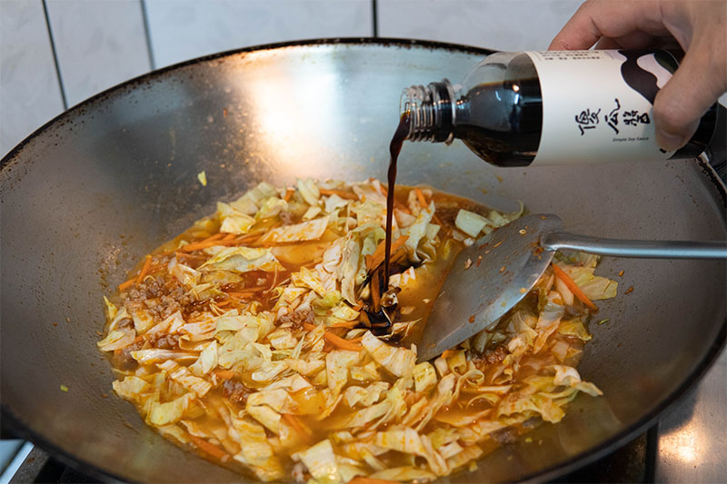 ➋爆香薑後倒入絞肉、辣豆瓣醬炒勻,再放入高麗菜、紅蘿蔔絲拌炒。