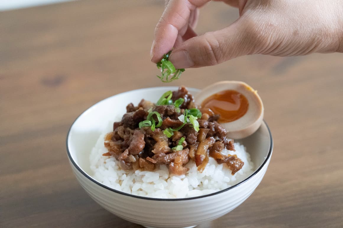 滷肉飯要使用手切的五花肉丁,每口都有肥瘦均勻的好口感, 將肉丁與冰糖炒至美麗的琥珀色, 再放入百草粉、草果、胡椒、八角等豐富辛香料, 燉煮到鹹香入味。