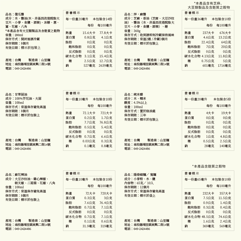 | 規格 | 拌麻醬/兩瓶 傻瓜醬/兩瓶 甘單蒜油/一罐 麻花辣油/一罐 純米醋/一瓶 陽春細麵/20入 陽春寬麵/20入 |