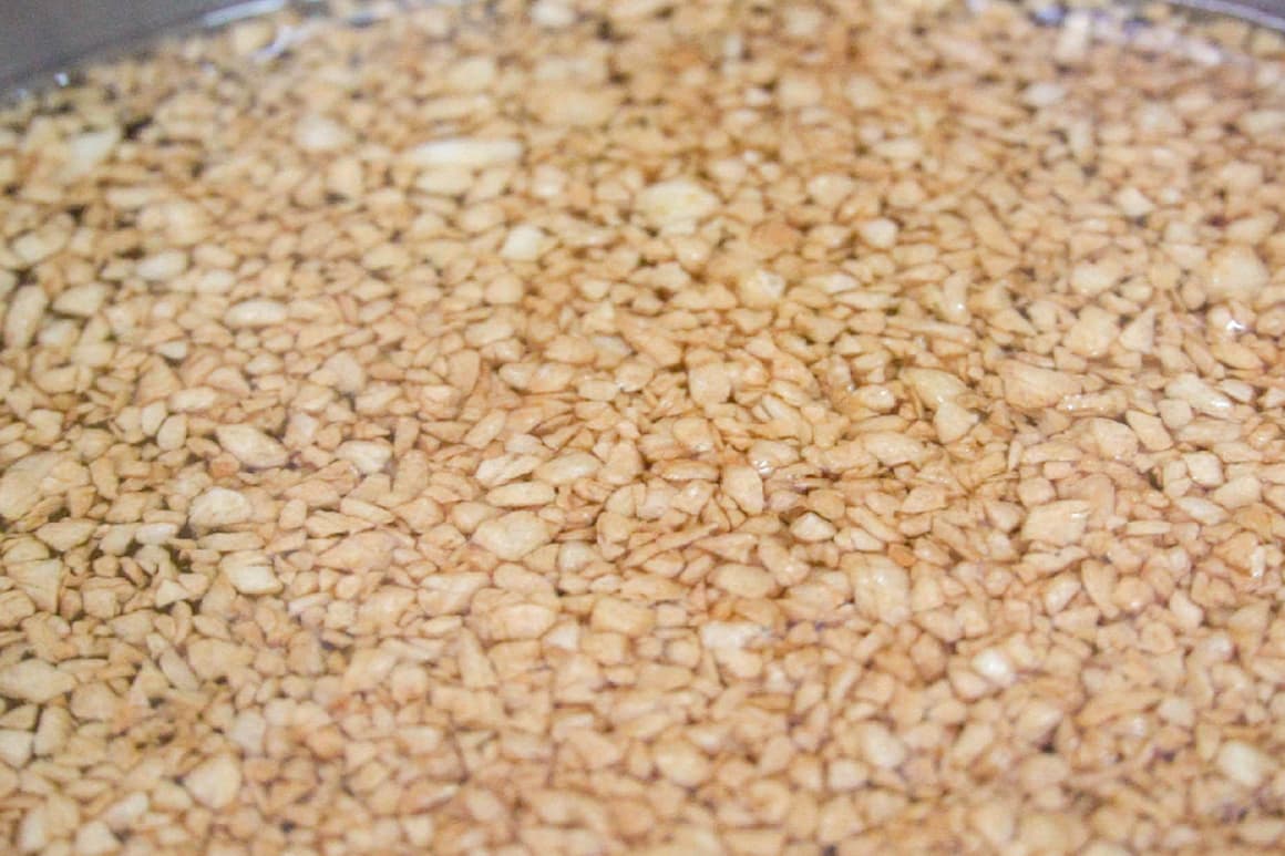 一顆顆蒜頭在廚房堆得像小山一樣,人工挑選剝皮洗淨後,去除口感不佳的蒂頭,打成大小適中的蒜粒。