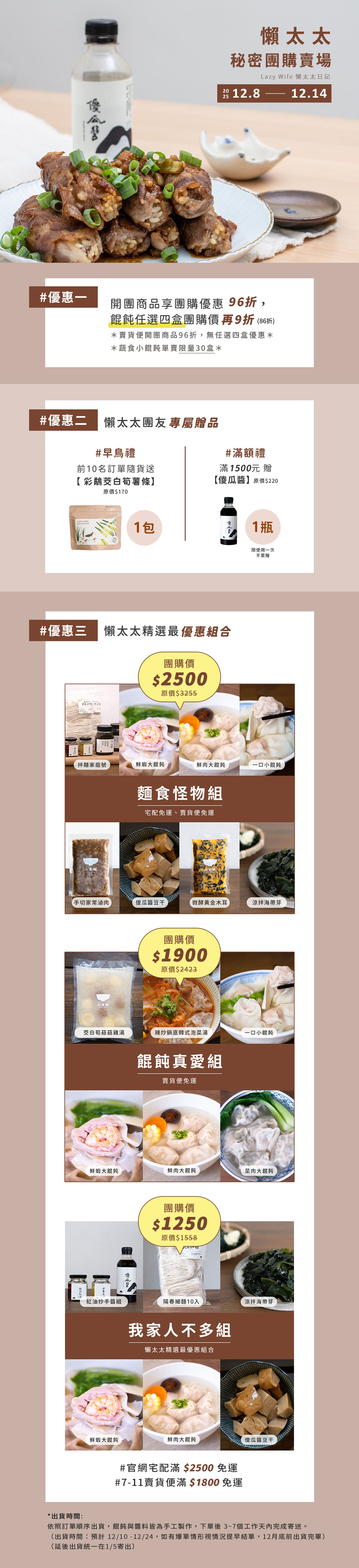 商品規格: 餛飩真愛組內容為: 茭白筍菇菇雞湯 ,共1包 辣炒鍋底韓式泡菜湯 ,共1包 鮮蝦大餛飩 / 一盒16顆,共1盒 菜肉大餛飩 / 一盒16顆,共2盒 鮮肉大餛飩 / 一盒16顆,共2盒 一口...