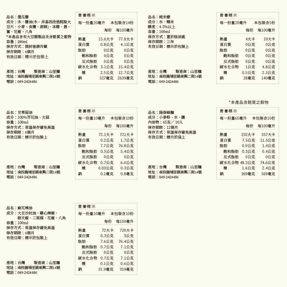 規格 | 傻瓜醬/一瓶 純米醋/一瓶 甘單蒜油/一罐 麻花辣油/一罐 陽春細麵/10入 |