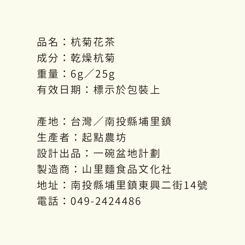 | 成分 | 乾燥杭菊(無農藥耕種、草生栽培、手工摘採) |