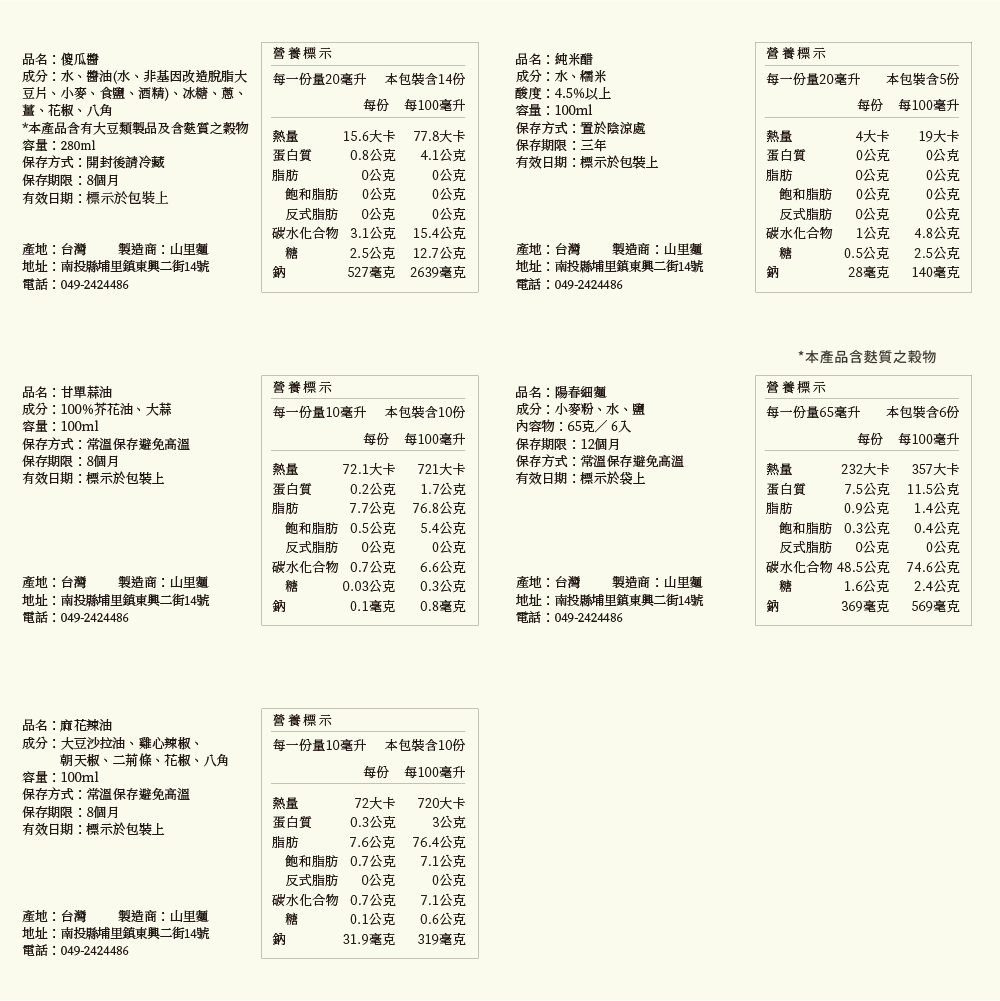 | 規格 | 【傻瓜醬/一瓶、甘單蒜油/一罐、麻花辣油/一罐、純米醋/一瓶、陽春細麵/6入】9入組 |