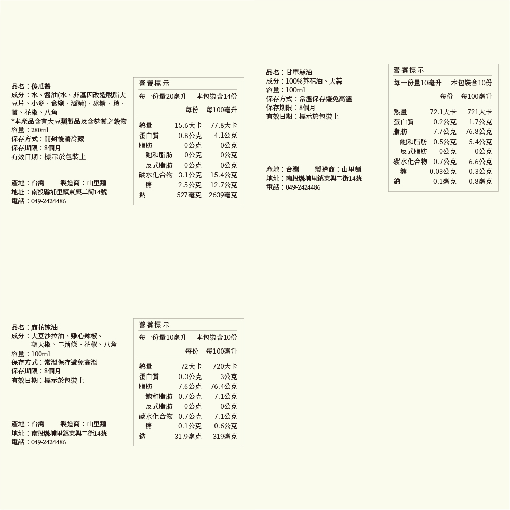 | 規格 | 【傻瓜醬/一瓶、甘單蒜油/一罐、麻花辣油/一罐】10入組 |