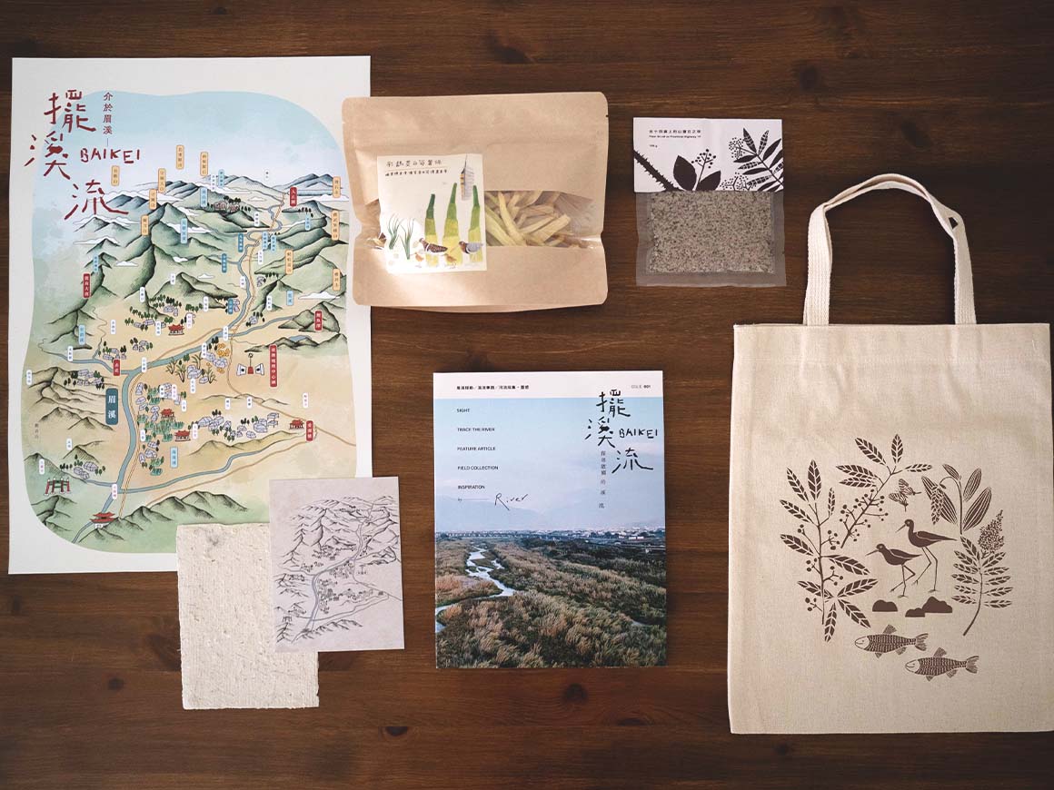 還有插畫家繪製了種眉溪沿岸特色動植物:鹽膚木、刺蔥、月桃、升天鳳蝶、高蹺鴴及台灣白魚,以一只手工絹印的帆布袋將所有的靈感打包。