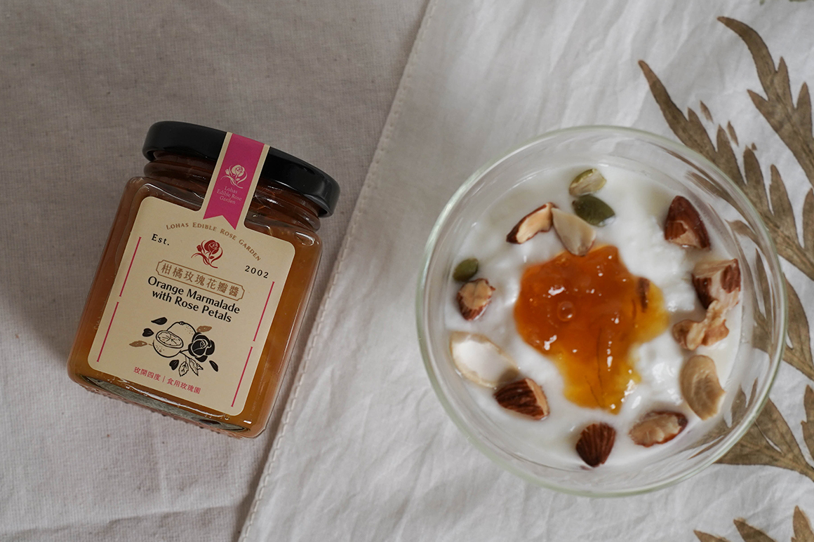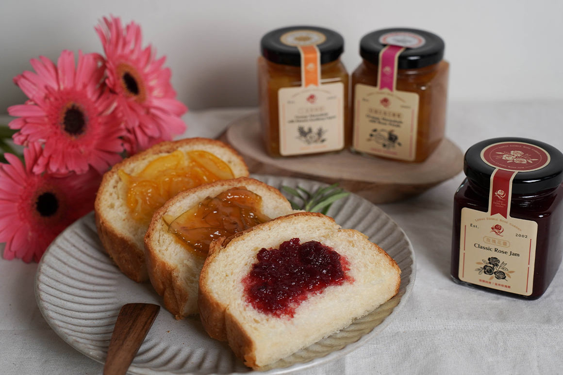 玫瑰花保鮮期短暫,因此製作成果醬,將玫瑰鮮甜的香氣封存。也意外開啟了夫婦兩人果醬的風味開發之路,餐飲背景讓他們對風味的挑選搭配有著獨特的見解,把關更是不遺餘力,自2021年參加英國的世界柑橘果醬大賽連年抱獎而歸。