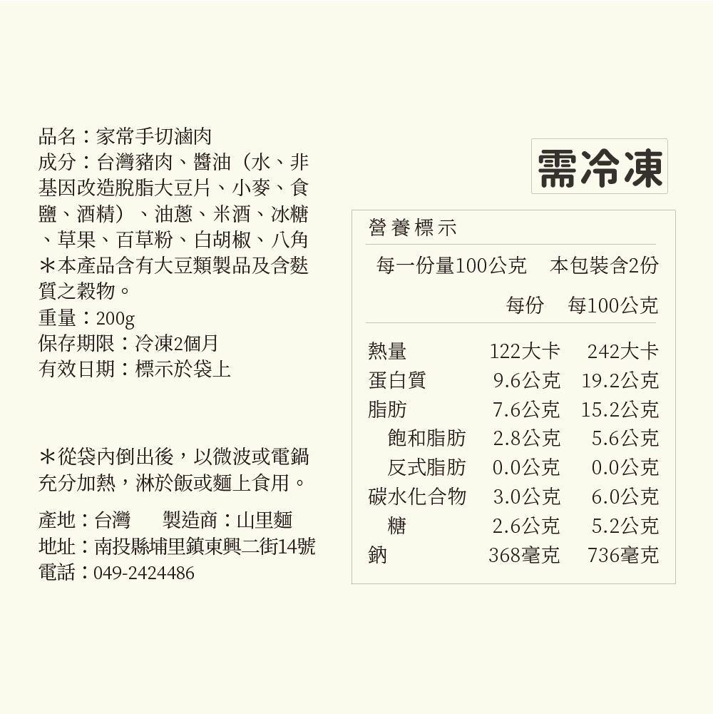 | 成分 | 豬肉(台灣)、醬油、油蔥、米酒、油膏、冰糖、草果、百草粉、白胡椒、八角 |