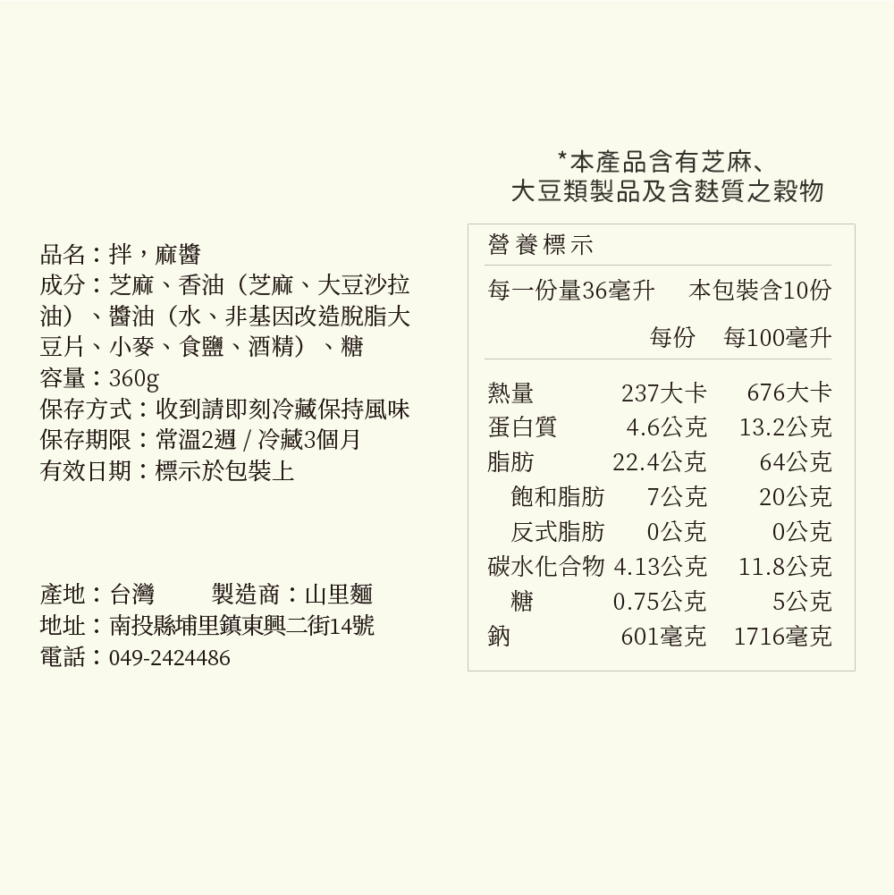 | 成分 | 芝麻醬、香油、醬油、糖 |