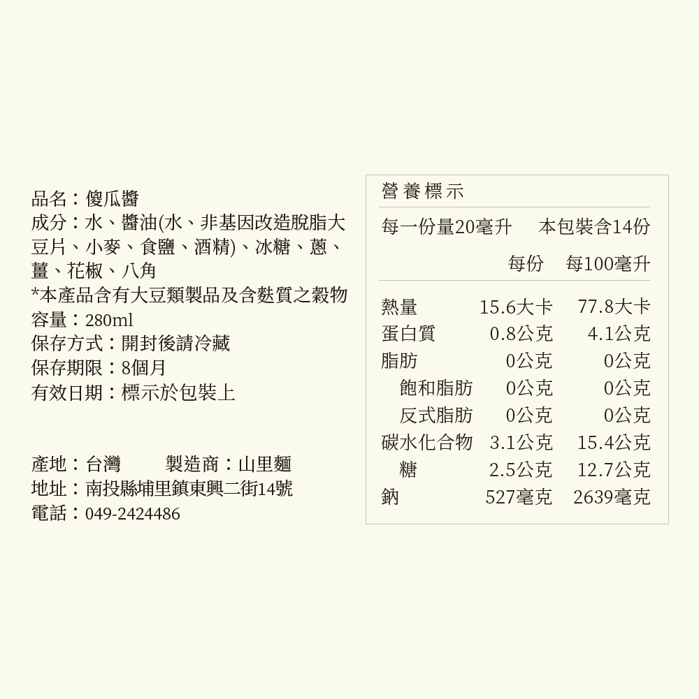 以台式「甜醬油」配方加以改良調製,選擇蔥、薑、八角、花椒等與醬油一起熬製,細火將辛香料風味融入醬料之中,成為薄鹽淡口但香氣十足的傻瓜醬。