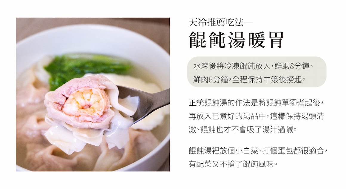 | 成分 | 台灣豬絞肉、生態養殖白蝦仁、餛飩皮(麵粉、水)、薑、香油、鹽 |