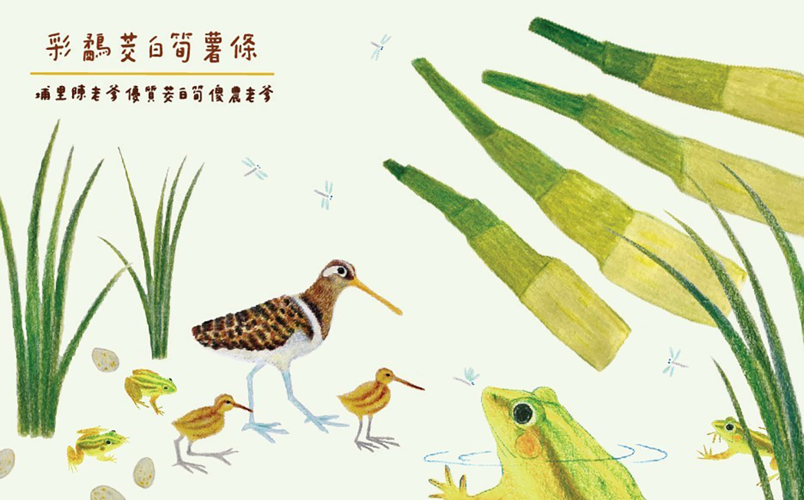 在田間帶著雛鳥漫步的彩鷸、因棲地減少在台灣越來越不容易看見的金線蛙,是守安這塊生態農法田區中的居民。我們以插畫將此生態樣貌收納於產品外包裝,與綠保標章上代表鳥、兩棲、人的腳印相呼應,傳達與自然共生共榮的願景。無農藥、無化肥種植出的農產品,不僅吃得安心,也為生物們保留一方安居。